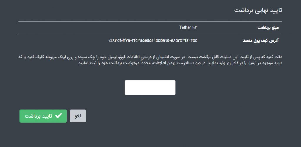 جهت تایید نهایی برداشت تتر، کدی که به ایمیل شما ارسال شده است را وارد نمایید.