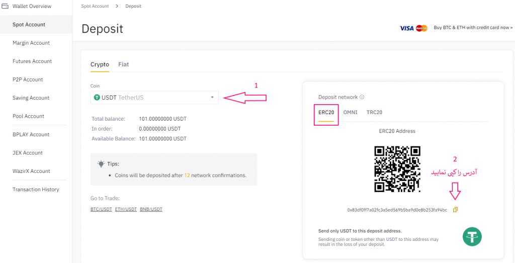 حال که آدرس مورد نظر را جهت افزایش اعتبار در دست داریم می‌توانیم از طریق یک صرافی داخلی معتبر این حساب را شارژ کنیم. فرض می‌کنیم شما قبلا طبق راهنمای خرید تتر(دلار دیجیتال)، کیف پول تتر خود را در صرافی داخلی شارژ نموده‌اید. در این مرحله طبق راهنمای ذیل می‌توانید از حساب تتر خود در صرافی داخلی به حساب تتر خود در بایننس تتر منتقل نمایید.
