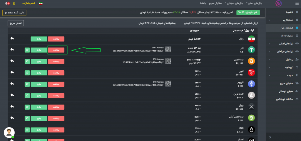 ابتدا وارد سایت نوبیتکس شوید. از بخش کیف‌های من، طبق تصویر جهت رویت آدرس کیف پول تتر، دکمه سبز رنگ واریز را انتخاب نمایید.