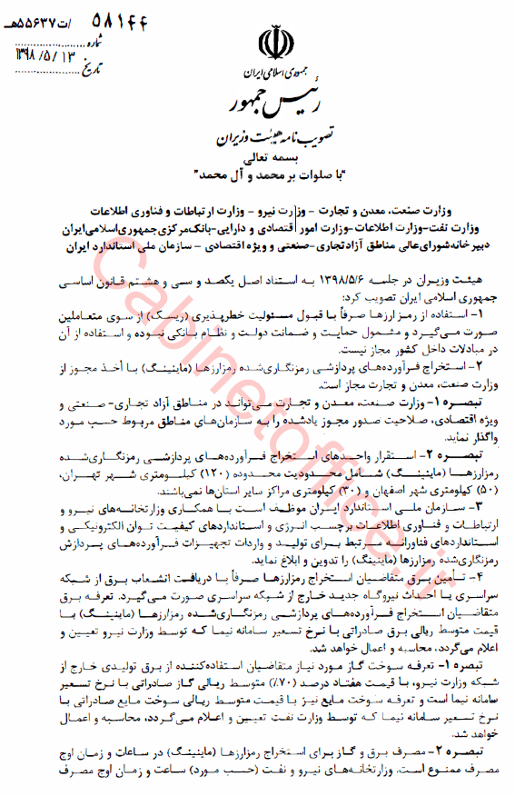 پس از آنکه وزارت نیرو، به صورت رسمی، تعرفه برق دستگاه‌های استخراج ارز دیجیتال را ابلاغ کرد، وزارت صمت نیز دستورالعمل صدور پروانه کسب و کار و استخراج ارز دیجیتال را صادر نمود: