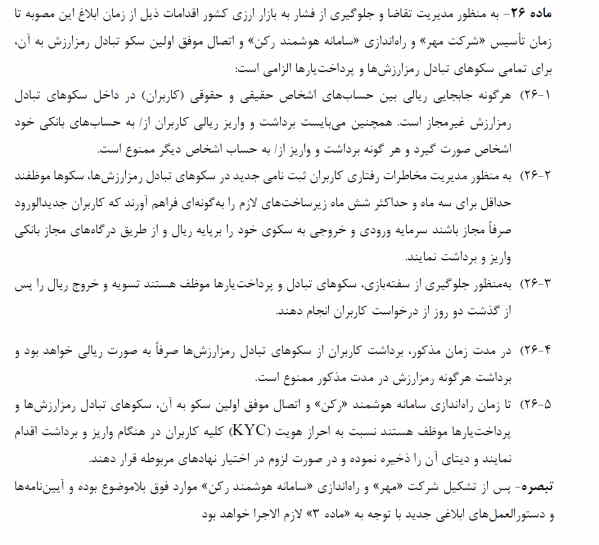 یکی از بخشهای قابل تامل طرح پیشنهادی، لزوم توقف برخی فعالیتهای صرافیها تا زمان تاسیس شرکت مهر و راهاندازی سامانه رکن است. طبق ماده 26 هرگونه جا به جایی ریالی بین کاربران حقیقی و حقوقی غیرمجاز است و برداشت و واریز بایستی از حساب بانکی خود شخص صورت گیرد. همچنین در این بازه زمانی تنها امکان برداشت ریالی وجود داشته باشد و هیچکس نبایست رمزارز خریداری شده را به ولت خود منتقل کند.