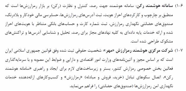 مهمترین قسمت بخش اول، بحث راهاندازی «سامانه هوشمند رکن» و «شرکت مرکزی هوشمند رمزارزش مهر» است. طبق ماده 6-1 سامانه رکن جهت رصد، کنترل و نظارت بر بازار رمزارزها است که کارکردهایی همچون احراز هویت، ثبت آدرسهای رمزارز، حسابرسی مالی خودکار، ثبت شماره کارت و حسابهای بانکی هویتهای احراز شده است.